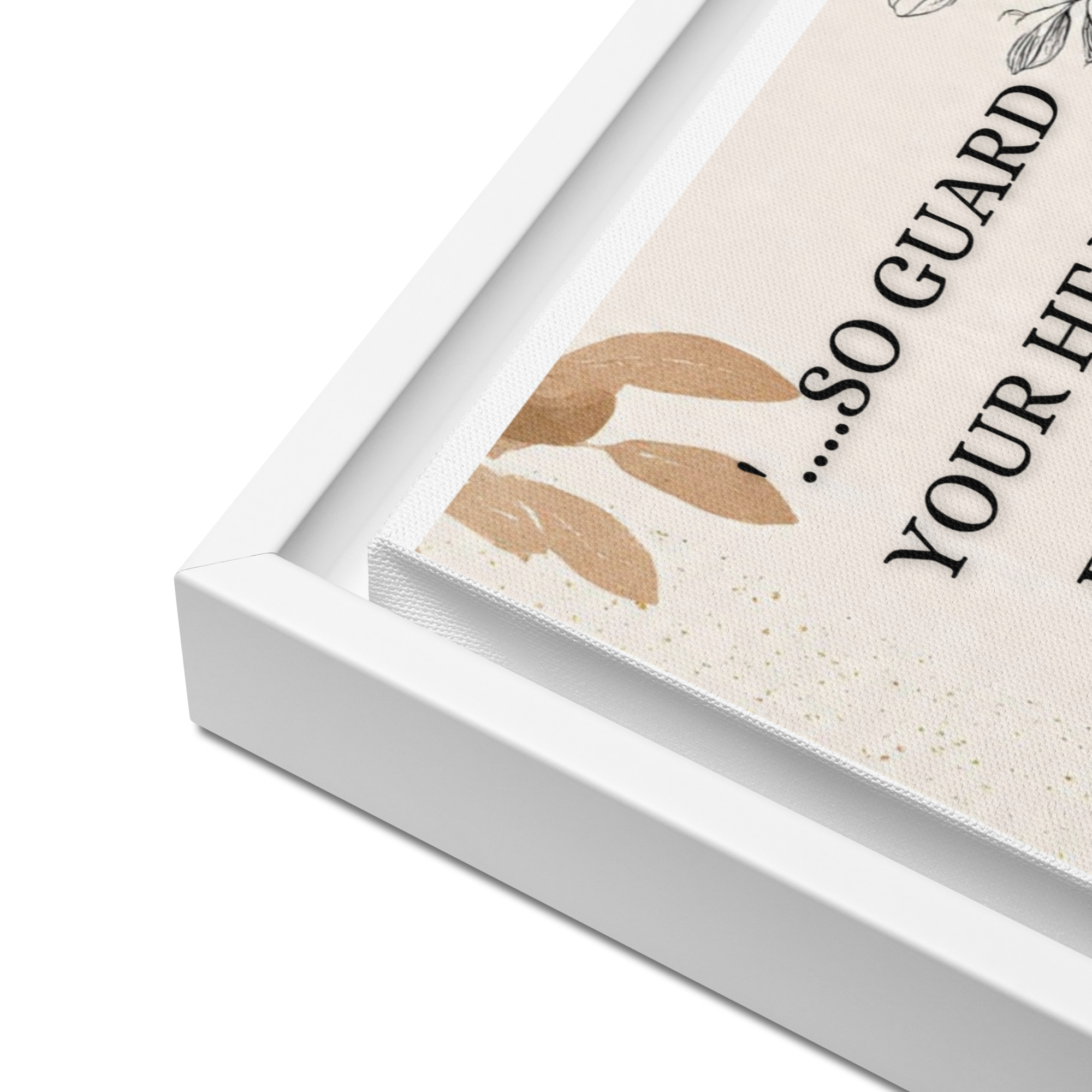 – The framed canvases with brown and black frames have a black inside around the canvas, and the canvases with white frames have a white inside around the canvas.